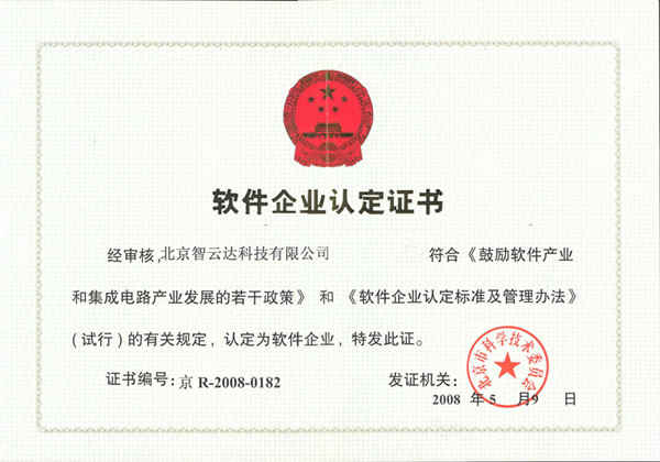 北京智云達(dá)軟件企業(yè)認(rèn)證證書(shū)