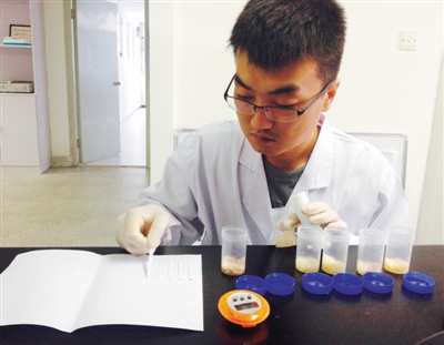 12日,北京智云達食品安全檢測消費者體驗中心,實驗人員先對泡椒鳳爪樣品進行了雙氧水快速檢測,結果顯示六種樣品中均未含雙氧水。隨后進行的防腐劑山梨酸測試結果顯示,一種樣品溶液為粉紅色(圖)。