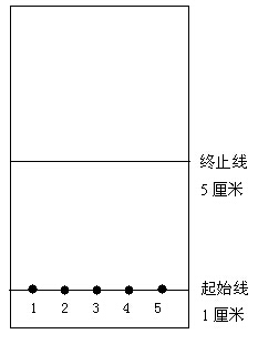選取一張展開板(薄層板),在展開板上距底邊1厘米和5厘米處各輕畫一條鉛筆橫線(起始線和終止線)。再用鉛筆在起始線上點(diǎn)5個(gè)標(biāo)記點(diǎn),間距為0.8厘米。如圖1所示。