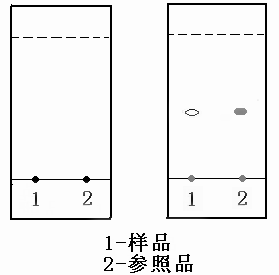 取一片硅膠板,在白色涂層面底端向上約1厘米處,用鉛筆畫一條直線,取兩點分別作為樣品和參照品的點樣點(如圖所示)。取1支毛細(xì)管,將其下端浸入樣品上清液中,停留2秒后取出,與樣品點樣點垂直接觸。點樣斑點揮干后,再重復(fù)點樣一次(斑點直徑控制在5毫米以內(nèi))。另取毛細(xì)管取參照品溶液在參照品點樣處進行點樣,晾干后備用。