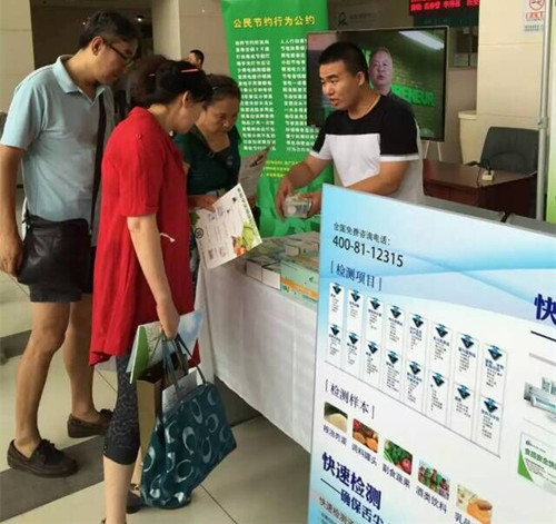 技術(shù)人員現(xiàn)場攜帶乳制品中蛋白質(zhì)速測盒、餐飲具表面潔凈度速測盒、二氧化硫速測盒、鹽酸克倫特羅速測盒、快檢家庭套裝、水無憂速測卡、奶無憂膠體金卡、地溝油多參數(shù)快篩試劑盒等多款快檢產(chǎn)品,吸引了一批有一批人群圍觀,技術(shù)人員并為感興趣的做現(xiàn)場演示。