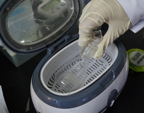 將樣品粉碎,稱取粉碎的樣品1.0 g,于50 mL三角瓶中,加蒸餾水19 mL,A溶液1 mL,充分搖動(dòng),超聲5分鐘,靜置5分鐘,過濾,濾液備用。