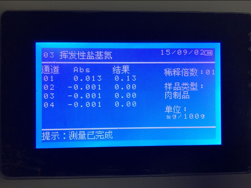 放入儀器中,檢測。檢測結果顯示揮發性鹽基氮含量。鮮(凍)畜肉≤15mg/100g,樣品中揮發性鹽基氮含量合格,符合國家標準。