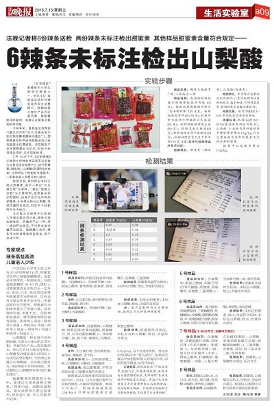 2016年7月14日12點,北京智云達科技股份有限公司再次與法制晚報聯(lián)合在食品安全檢測消費者體驗中心進行食品檢測實驗,并在樂嗨直播平臺進行現(xiàn)場直播,二戰(zhàn)告捷。如今食品安全問題往往是一波未平一波又起,維護食品安全迫在眉睫。本期主要內(nèi)容是對不同種類辣條進行甜蜜素和山梨酸鉀含量檢測。