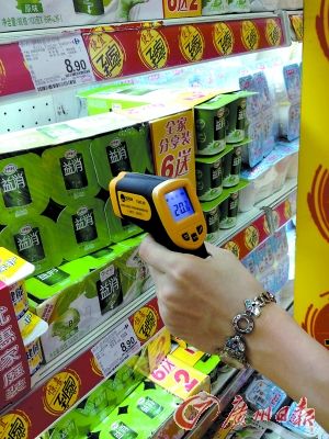 5日中午12時,在芳村的好又多超市,立式冷柜都帶有透明的塑料簾以防溫度上升,但在其他的臥式冰柜,卻有5個柜門大開,里面擺放的酸牛奶絲毫無涼意。記者用紅外測溫儀檢測,發現最上方的一組酸奶,包裝溫度已經達到了24.2℃。促銷員告訴記者,該品牌的酸奶是暫時放在臥式冰凍柜里用于周轉的,“上面一層不怎么冰,下面都是冰的。”不過記者檢測發現,即使最下層的牛奶溫度也是8.7℃。