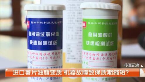 記者找到了專業(yè)的檢測(cè)人員,對(duì)薯片里的油進(jìn)行酸價(jià)和過(guò)氧化值的檢測(cè)。經(jīng)檢測(cè),這款薯片里油脂的酸價(jià)和過(guò)氧化值均超過(guò)了正常范圍,證明薯片使用的植物油已經(jīng)酸敗。