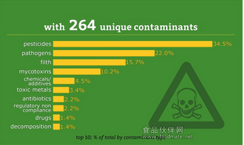統(tǒng)計數(shù)據(jù)還顯示,出問題的食品包括:海鮮(23.5%)、蔬菜(20%)、水果(13.8%)、香菜/調(diào)味品(8.9%)、乳品(7.5%)。食品違規(guī)類型包括農(nóng)殘(34.5%)、病菌(22.0%)、污物(15.7%)、真菌毒素(10.2%)、化學(xué)物質(zhì)/添加劑(4.5%)。
