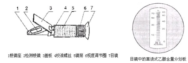 4.4 取酒樣 5~7 滴放在檢測棱鏡面上,徐徐合上蓋板,以下操作與 3.2 相同。視場明暗分界線處所示讀數,即為乙醇含量%。重復操作幾次,使讀數穩定。4.2 取酒樣 5~7 滴放在檢測儀棱鏡面上,緩緩合上蓋板。讀取視場明暗分界線處所示讀數,即為乙醇百分含量。重復操作幾次,使讀數穩定。