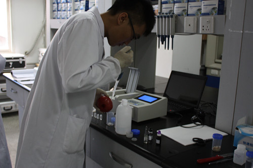 1、滴8ml農(nóng)殘緩沖液在西紅柿表面于干凈容器中。