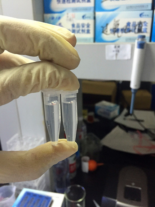 準確稱取1克樣品并盡可能剪成小碎片,加蒸餾水或純凈水至50mL,蓋上蓋振搖。放臵10分鐘以上,其間振搖以加速提取,其上清液即為樣品液。在1.5ml離心管中先滴加2滴檢測液A,1滴檢測液B,上下?lián)u動,混勻;然后加入1ml樣品液,立即蓋塞混勻。放置5分鐘觀察顏色變化,并與色卡對照。
