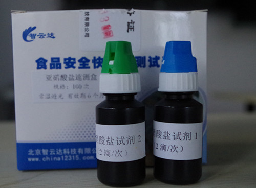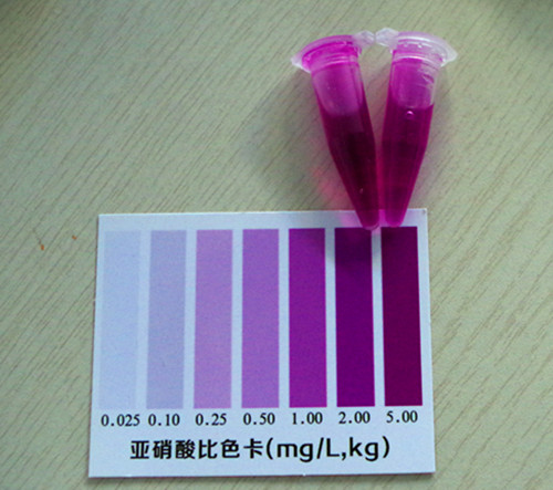 加入2滴試劑2搖勻靜置10分鐘后與標準比色卡對比,該比色卡上的數(shù)值乘上10即為樣品中亞硝酸鹽的含量mg/kg(以NaNO2計)。
