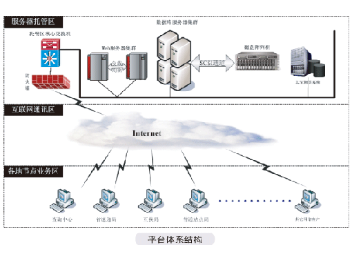 整個系統(tǒng)是建立在以互聯網連接為基礎的集中式業(yè)務處理系統(tǒng)。其總體結構分為三個層:以服務器托管區(qū)服務器構成的業(yè)務及數據處理中心、互聯網通訊區(qū)、中速及各地的業(yè)務處理節(jié)點,層次結構圖如左所示: